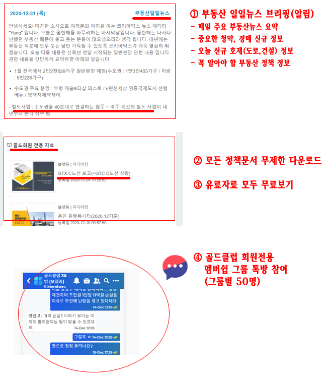 매일 부동산뉴스(뉴스 및 신규호재정보 등)요약알림, 무제한 문서 다운로드, 골드회원만이 입장가능한 부동산투자 챗팅방 입장코드를 받게됩니다.